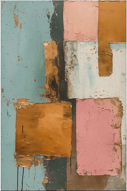 Light turquoise blocks with pale pink accents and warm neutrals—soft asymmetrical overlaps for serene entries or bedrooms. Subtle metallic hints add depth.