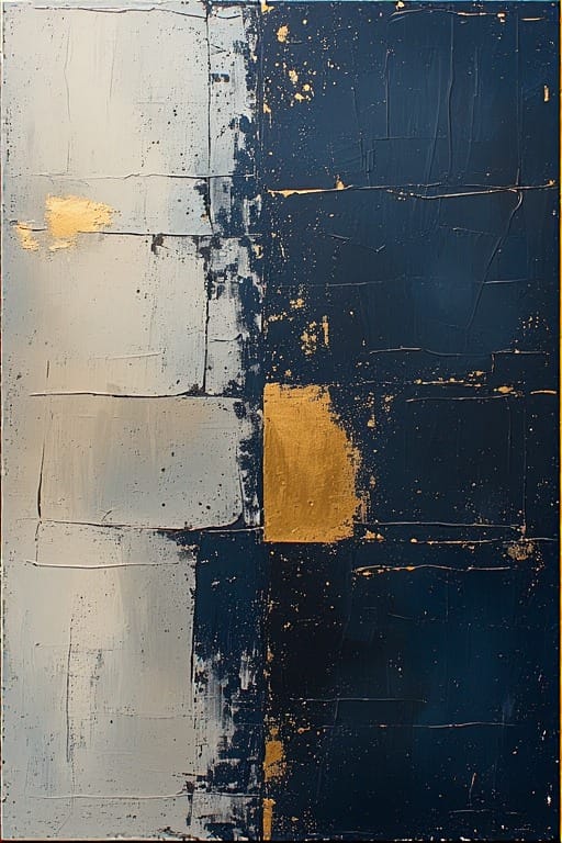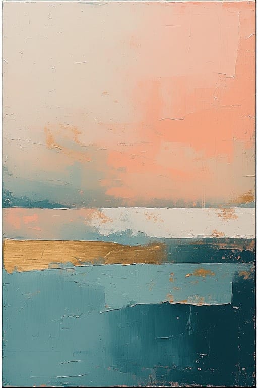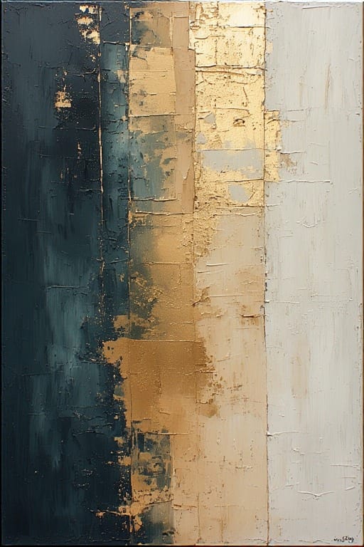 Warm neutrals and metallic blocks—textured edges like soft studio collage. Anchor for coastal offices or airy homes.