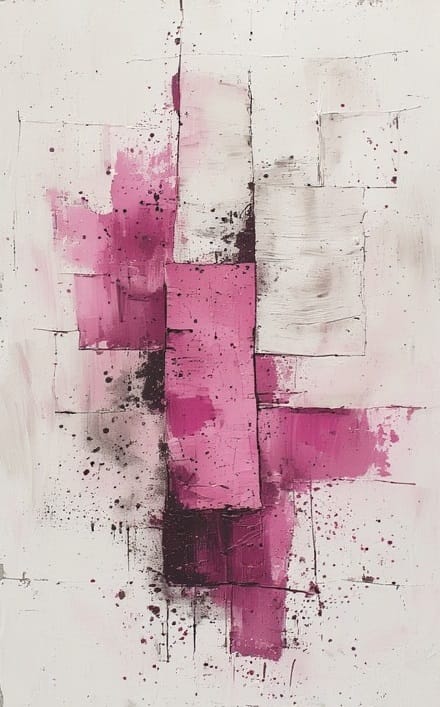 Fuchsia-raspberry geometries bleeding into neutrals—dynamic tension for hotel lobbies or modern living rooms. Designer wellness favorite.