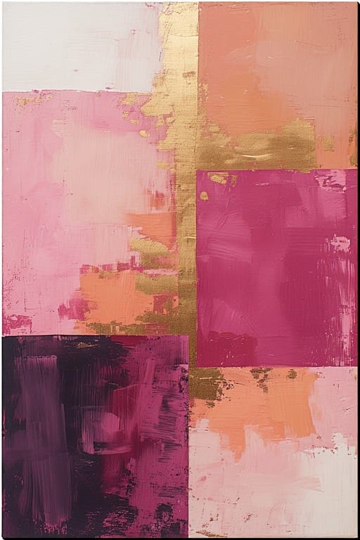 Raspberry-fuchsia blocks layered over warm neutrals with metallic gold accents—vibrant asymmetrical overlaps for wellness spaces or creative offices. Energizing yet balanced.