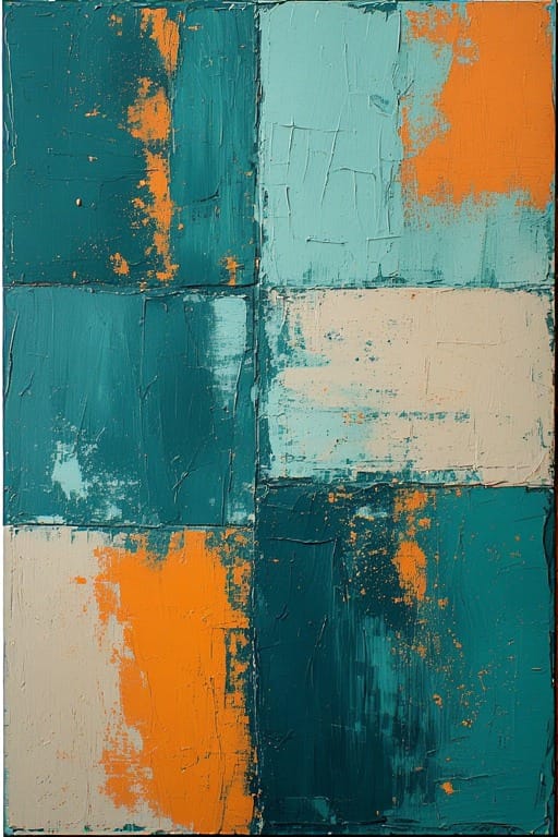 Teal blocks with tangerine pops and neutrals—vibrant brushed overlaps for bold entries or creative studios.